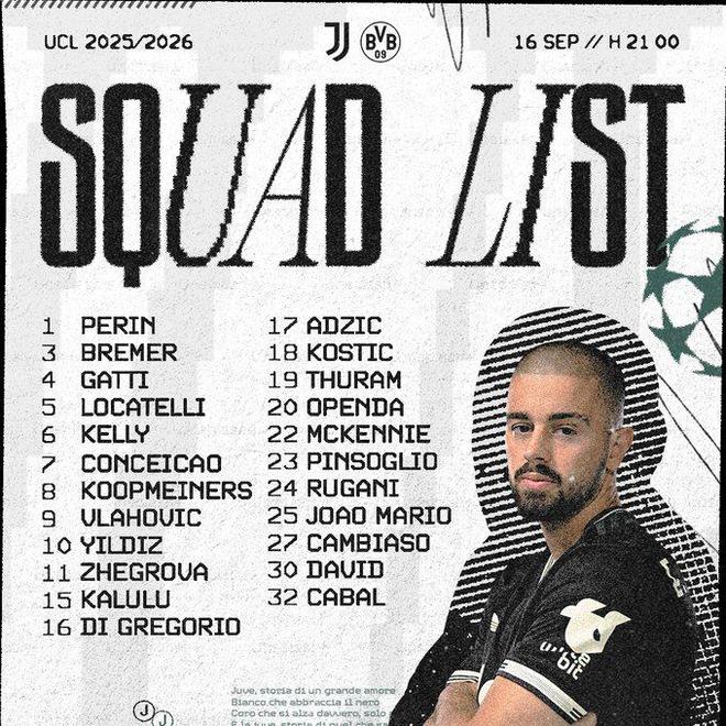 雷速体育9月16日讯 2025-26赛季欧冠联赛阶段第一场比赛,尤文图斯将在主场迎战多特蒙德,比赛在北京时间9月17日凌晨3点进行。尤文图斯官方公布了这场比赛的大名单,新援乔纳森·戴维、奥彭达等人领衔,上一轮意大利德比中绝杀国米的小将阿季奇入选。