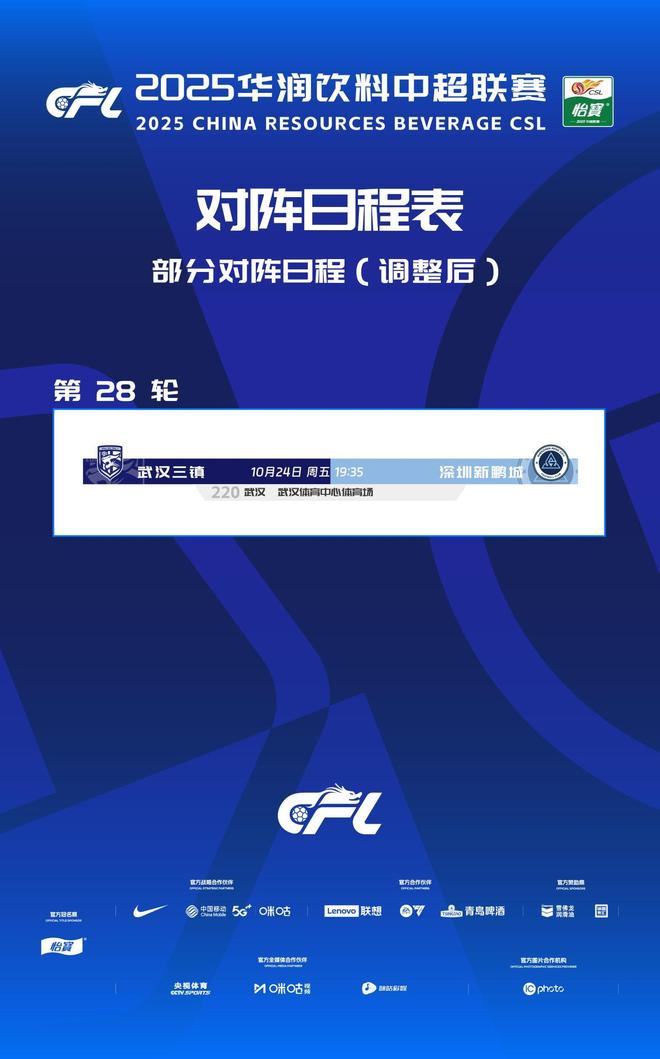 根据2025华润饮料中超联赛赛程,武汉三镇对阵深圳新鹏城比赛将于10月25日19:35在武汉体育中心体育场进行,因武汉体育中心大型活动,为保证本场比赛安全有序进行。经武汉赛区申请,协商武汉三镇足球俱乐部、深圳新鹏城足球俱乐部以及有关方面同意,现决定将武汉三镇对阵深圳新鹏城比赛进行调整,具体调整如下: