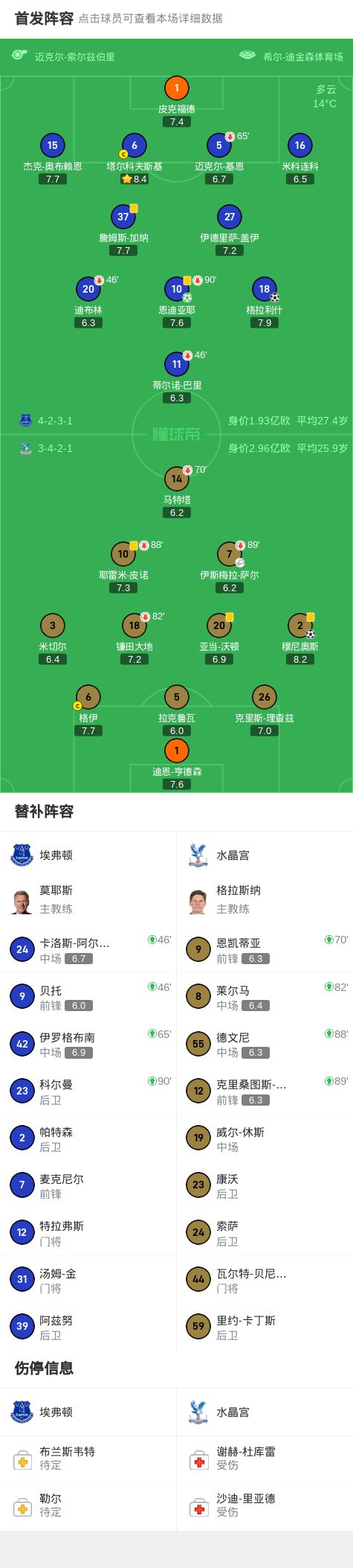 第38分钟,伊斯梅拉-萨尔反击助攻,穆尼奥斯跟进推射破门,水晶宫1-0!