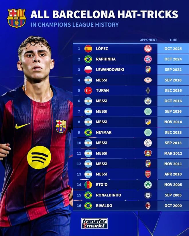 根据统计,费尔明是欧冠改制(1992-93赛季)以来,巴萨队史第16位在欧冠当中完成帽子戏法的球员。