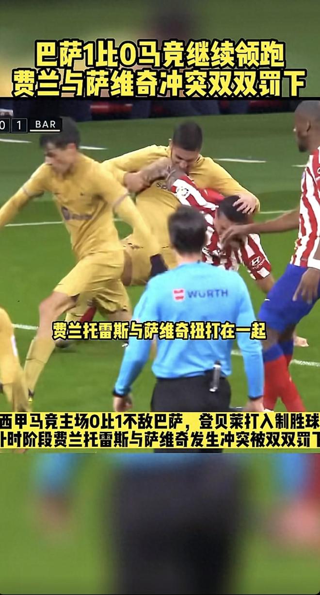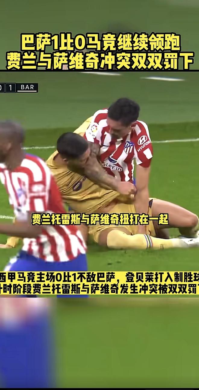 兄弟们,昨晚西甲这场巴萨打马竞的比赛,那叫一个刺激!巴萨靠着登贝莱的制胜球,1-0在马竞主场把三分揣兜里了,现在继续在积分榜上领跑。但要说最抓马的,还得是补时阶段费兰·托雷斯和萨维奇那顿互殴,俩人直接双双被罚下,这场面在西甲也算是相当炸裂了。